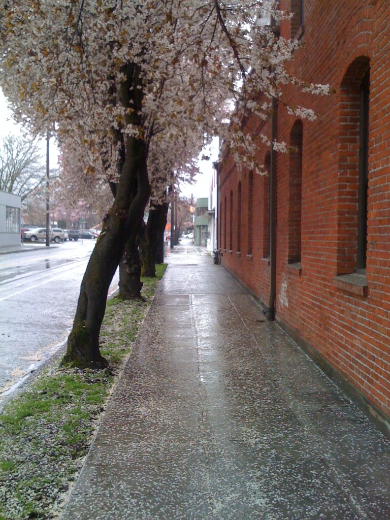 I loved the NW part of town for it’s walkability! There was a restaurant, coffee shop, salon or business on every block and great access to public transportation. Here are cherry blossoms being washed off the trees by rain.