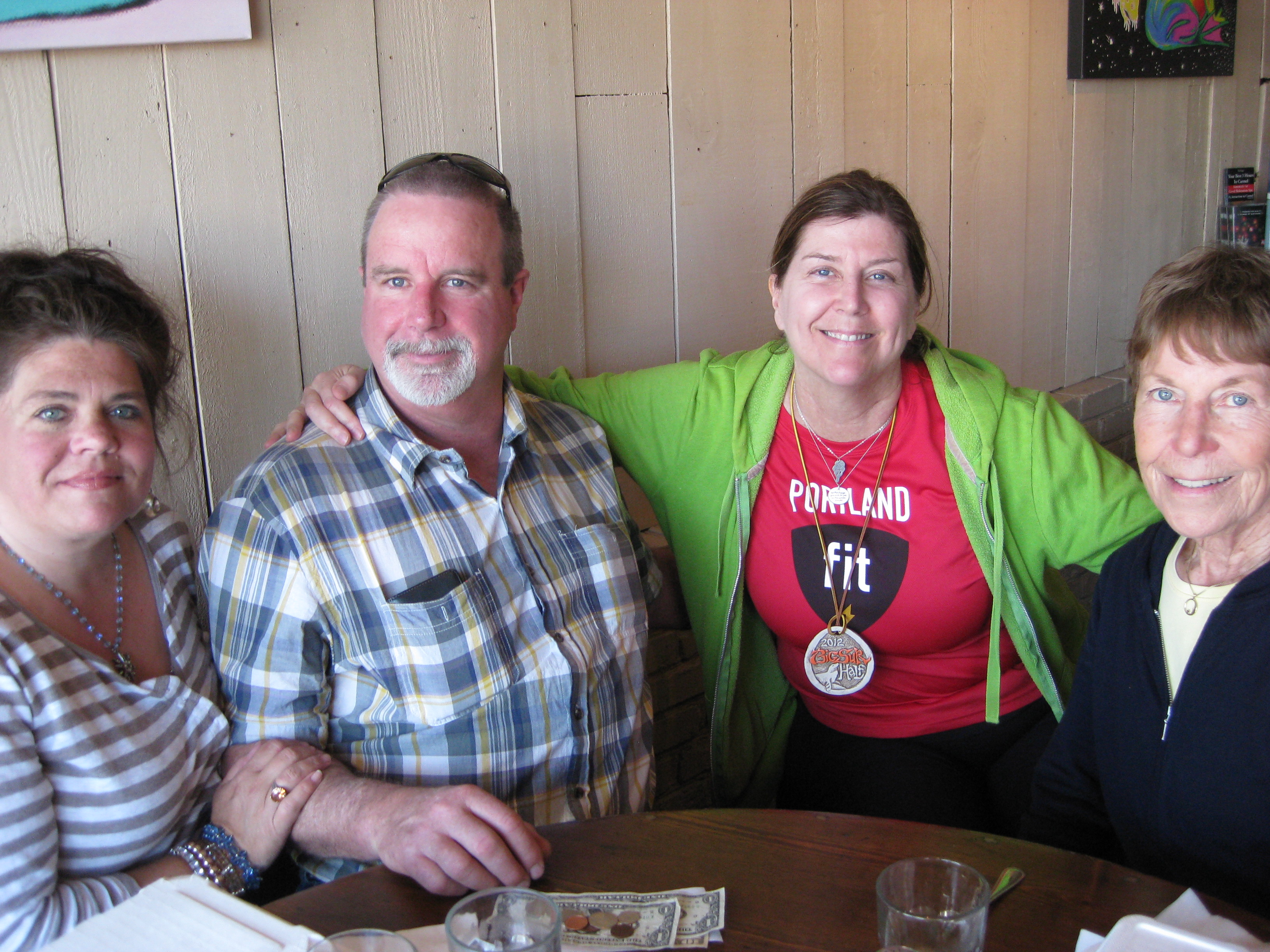 The next morning Keith and Hillary got up at the crack of dawn to take me to the starting line for the Big Sur Half Marathon. Weather reports warned of rain, but as luck would have it the skies opened up to sun and great walking weather! As I walked, I passed by places from my past that caused me to weep. I saw the house where Jim and Julie lived, Holman’s where my Mom bought me clothes back in grade school, the house that Dave (Myra’s Dad) lived in when we first met, the area near my first college home in Pacific Grove and the pool at Lover’s Point where I learned to jump off the high dive. The walk went smoothly, but around the 11th mile I began to crave seeing the 12-mile marker. I was surprised to hear “only 30 seconds left” as I rounded a corner. Mind you, I am still looking for the 12-mile marker…but I was now at the 13th mile. Guess they took the 12-mile marker down already. I decided to kick it into a run and made the finish within the 30 seconds. My family, Keith, Hillary, my Mom and my Aunt Elaine greeted me. They were ringing a cowbell and had an awesome sign that brought tears to my eyes. You see I am not a natural athlete. It has taken 3 years to work from walking a few miles, getting plantar faciitis, working my way to my first half marathon in 2011, to being able to do 3 half marathons in 2012. I have crossed a couple of finish lines to be greeted by no one, but to know that victory inside. But life is about sharing victories with those you love. That is the hugest part of my “renewal lesson” that unfolded. Yes, we all know it on a mental level, but this hit my core soul and emotional level.