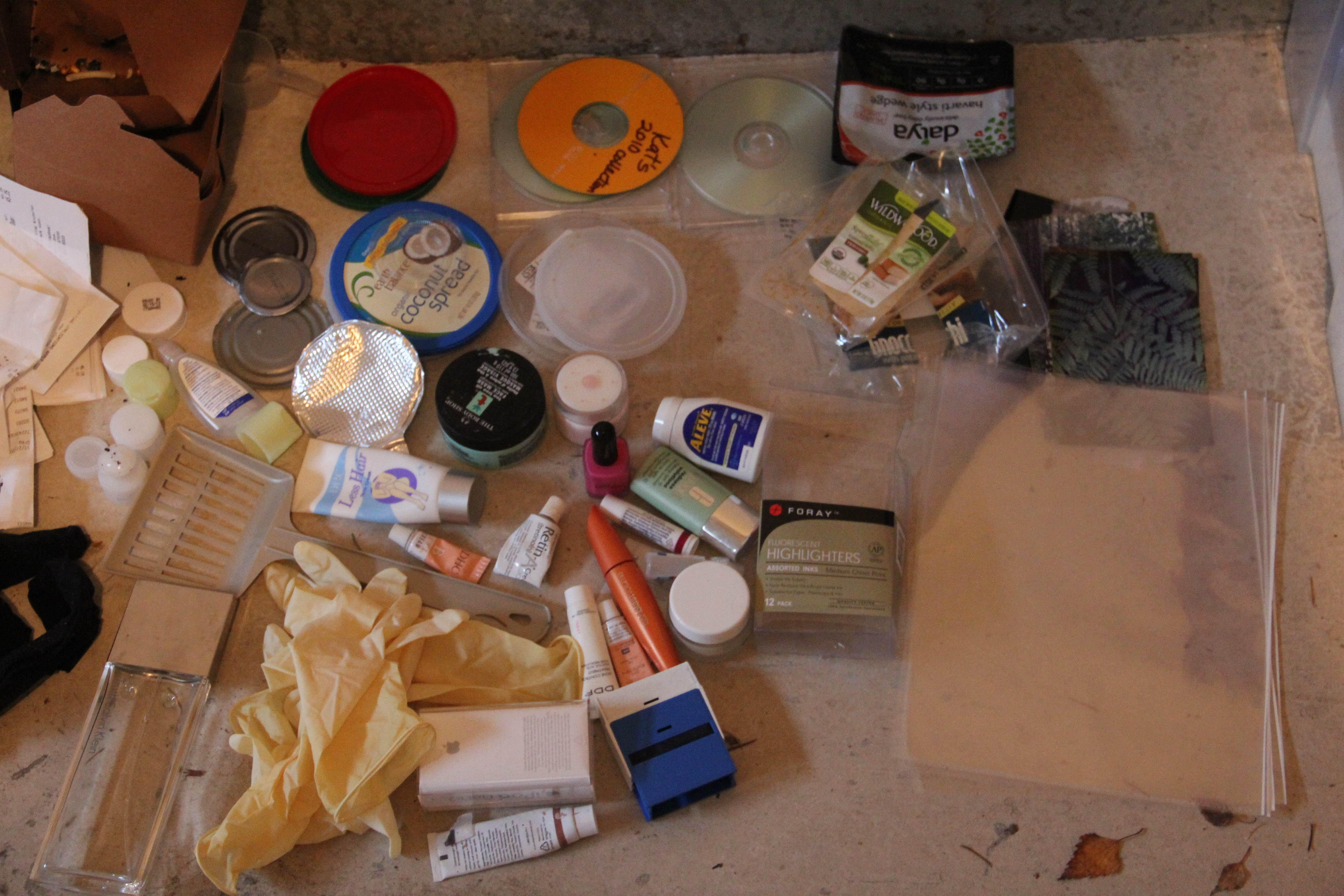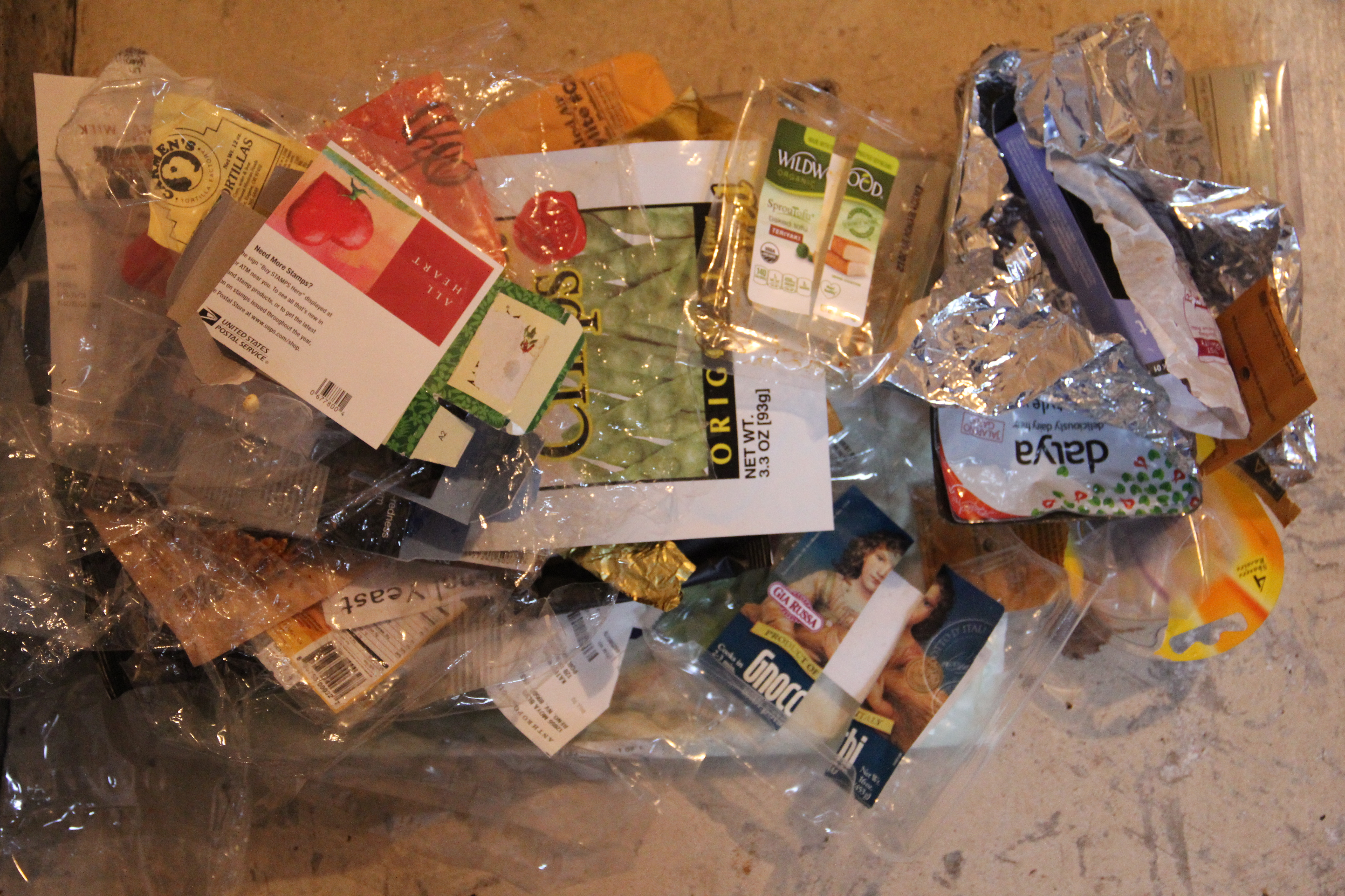 I saved my January trash for 4 weeks to see what my baseline use was.  Note:  In Portland we have curbside trash pick up that includes compostable foods in with yard waste.  We started doing this about a year ago and it has made a huge difference.  For one thing, it makes the trash I was sorting through dry and not disgusting.  And it dramatically reduced what goes out as trash (non-recycling, non- compost).  When Portland made this change, they went to every other week trash pick-up while continuing to pick up recycling and compost/yard waste weekly.  Note, this was also the month that I cleaned and organized my house, so I probably had more trash than usual.  Here is what I created as waste in 4 weeks: