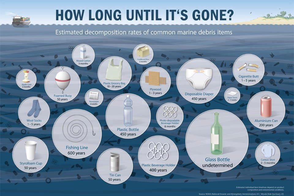 It’s easy to think plastic just goes away, but here is how long it takes to decompose.  Click on photo to enlarge.