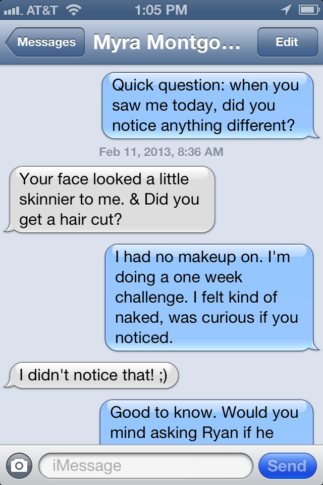 I then went out to lunch with my daughter and her husband. Being a Sunday, we had to wait to be seated, so we sat talking about an hour, then had our meal together. A couple of times I wondered if she noticed my face was bare as the day I was born, but nothing was said. The next day I texted her to see if she had noticed and you can see below how that played out.