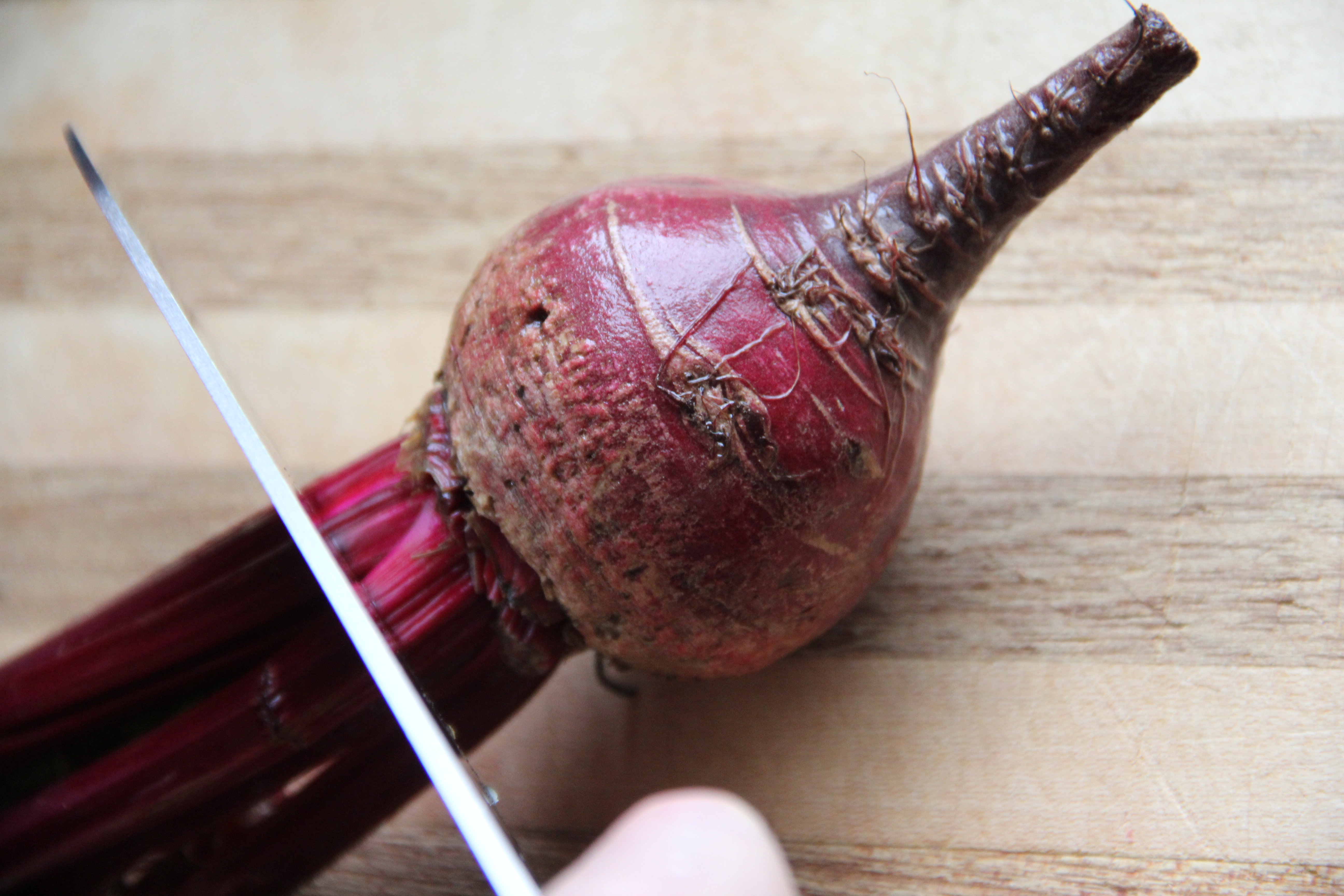 You can juice the beet greens as well as the beet itself, just cut off the portion where they join by making a cut near the base of the leaves and a second cut at the top of the beet. This removes that one section in which dirt can reside. You don’t want to have grit in your juice.