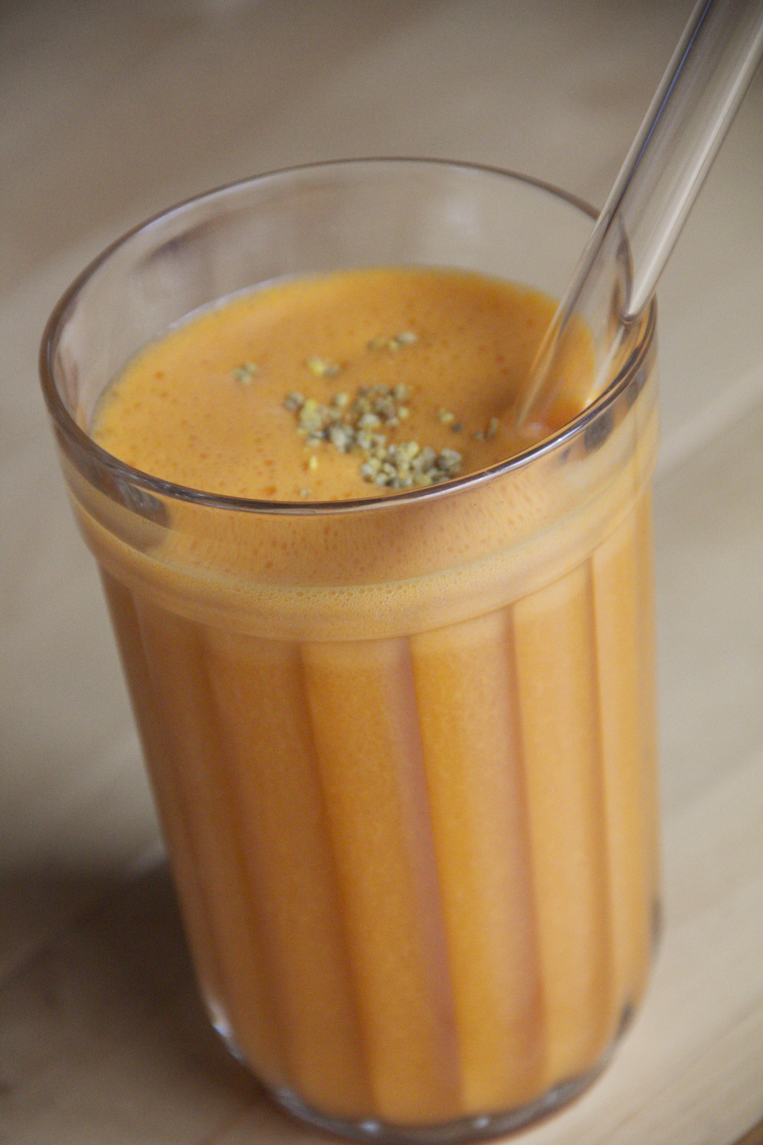 Peel and juice oranges, then juice carrots and ginger. Put the juice into a blender and add other ingredients. I often add a splash of apple cider vinegar for a contrast between the sweet flavors of the oranges and carrots. Blend until smooth and serve. This one is a real pleaser. You can easily serve it to non-juice lovers!