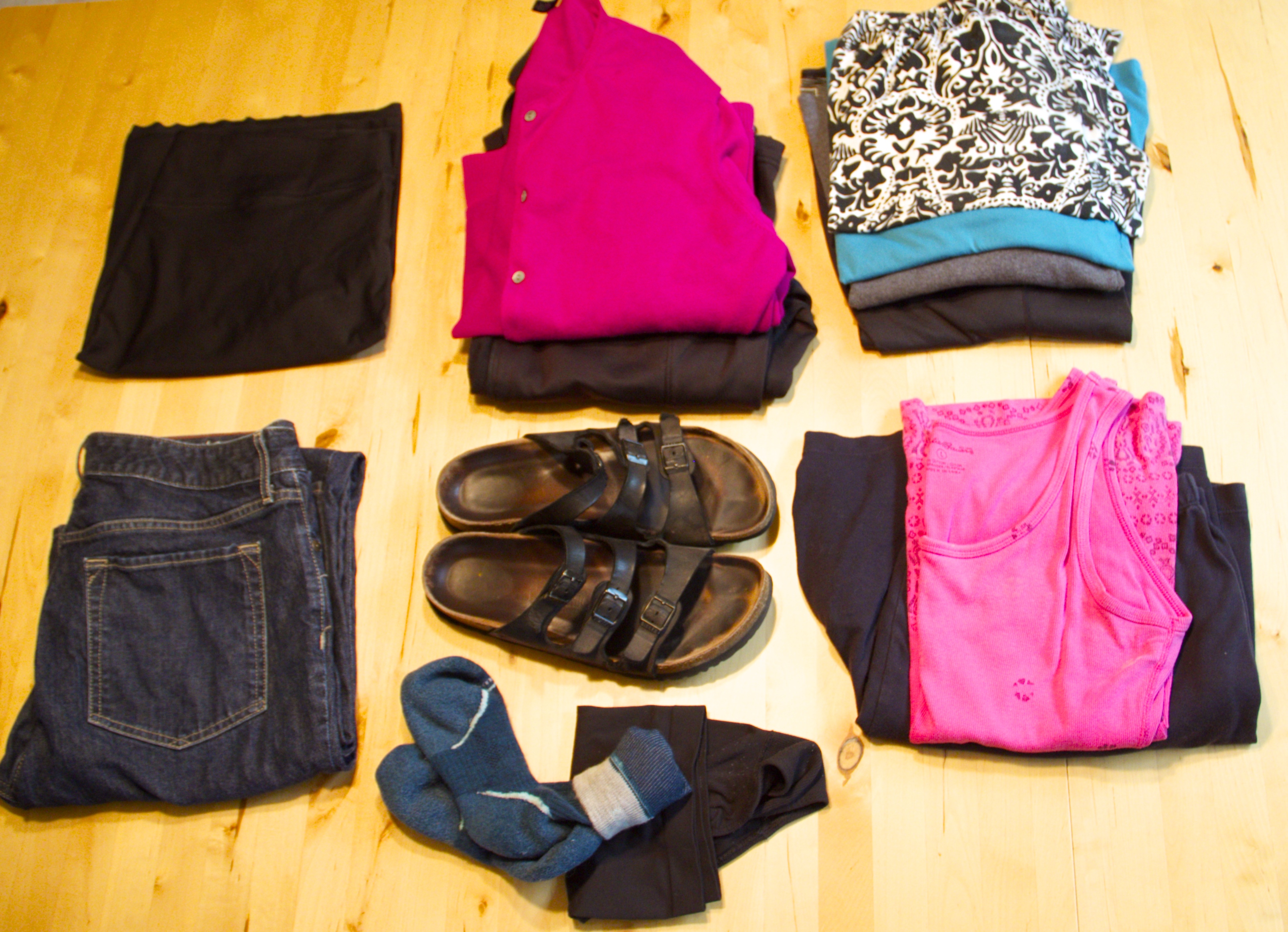 Clothes: Jeans, black skirt, fuchsia sweater, black jacket, 4 tops – 1 black long sleeve Flash Dry, 1 gray 3/4 sleeve, 1 blue tank and 1 black and white sleeveless. For sleep 1 pair of cotton shorts and 1 tank. Birkenstocks, socks and 1 extra pair of underwear.