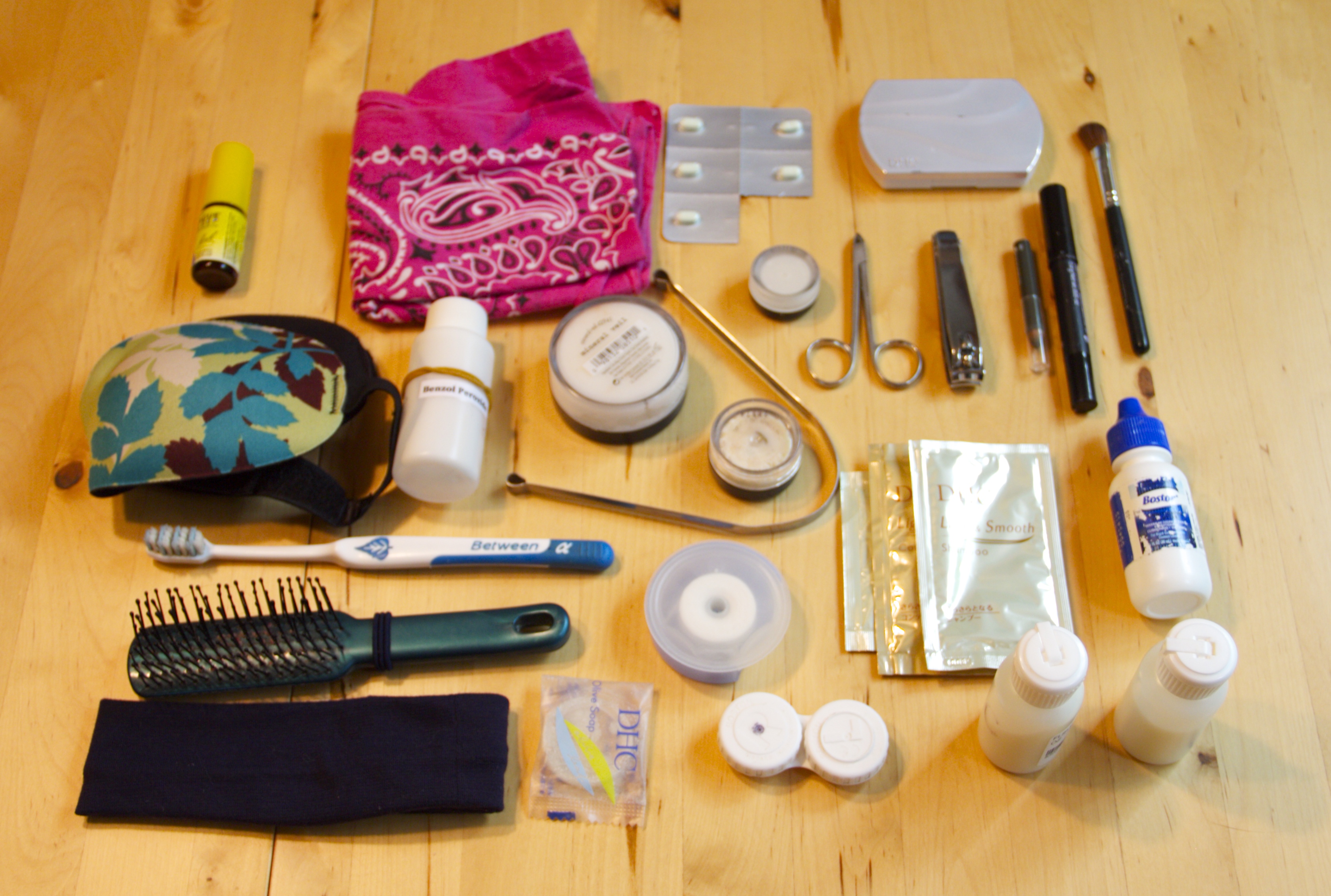 Personal items – Contacts, glasses, toothbrush, tooth powder, floss, tongue scraper, hairbrush, headband, soap, bandana, sleep mask, Rescue Remedy Sleep Formula, Immodium, shampoo, conditioner, benzol peroxide, deodorant, coconut oil, nail clippers, hangnail clippers, eye shadow and eyeliner.