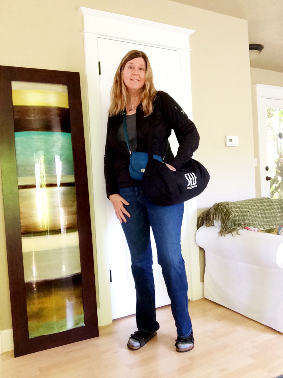 What I wore to the airport – Jeans, gray 3/4 sleeve shirt, jacket, socks and Birkenstocks. I can be hands-free and was able to help carry items for my Granddaughter.