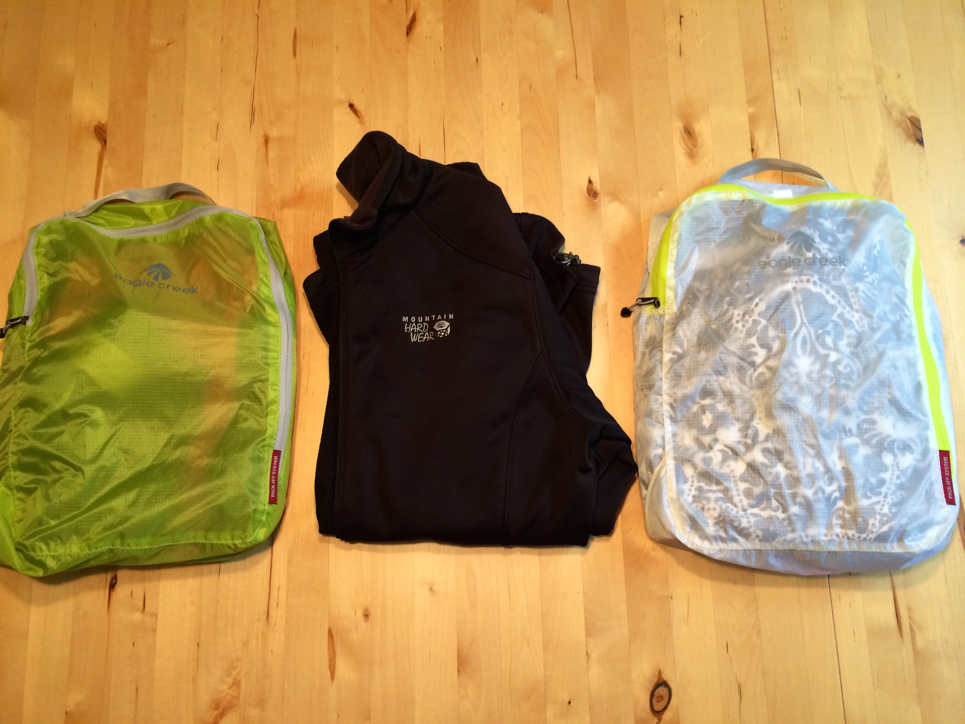 All of the above clothes fit into these Eagle Creek bags. I put tops in one bag and bottoms and sweater in the other. I kept the jacket for the flight to use if it gets cold on the plane.