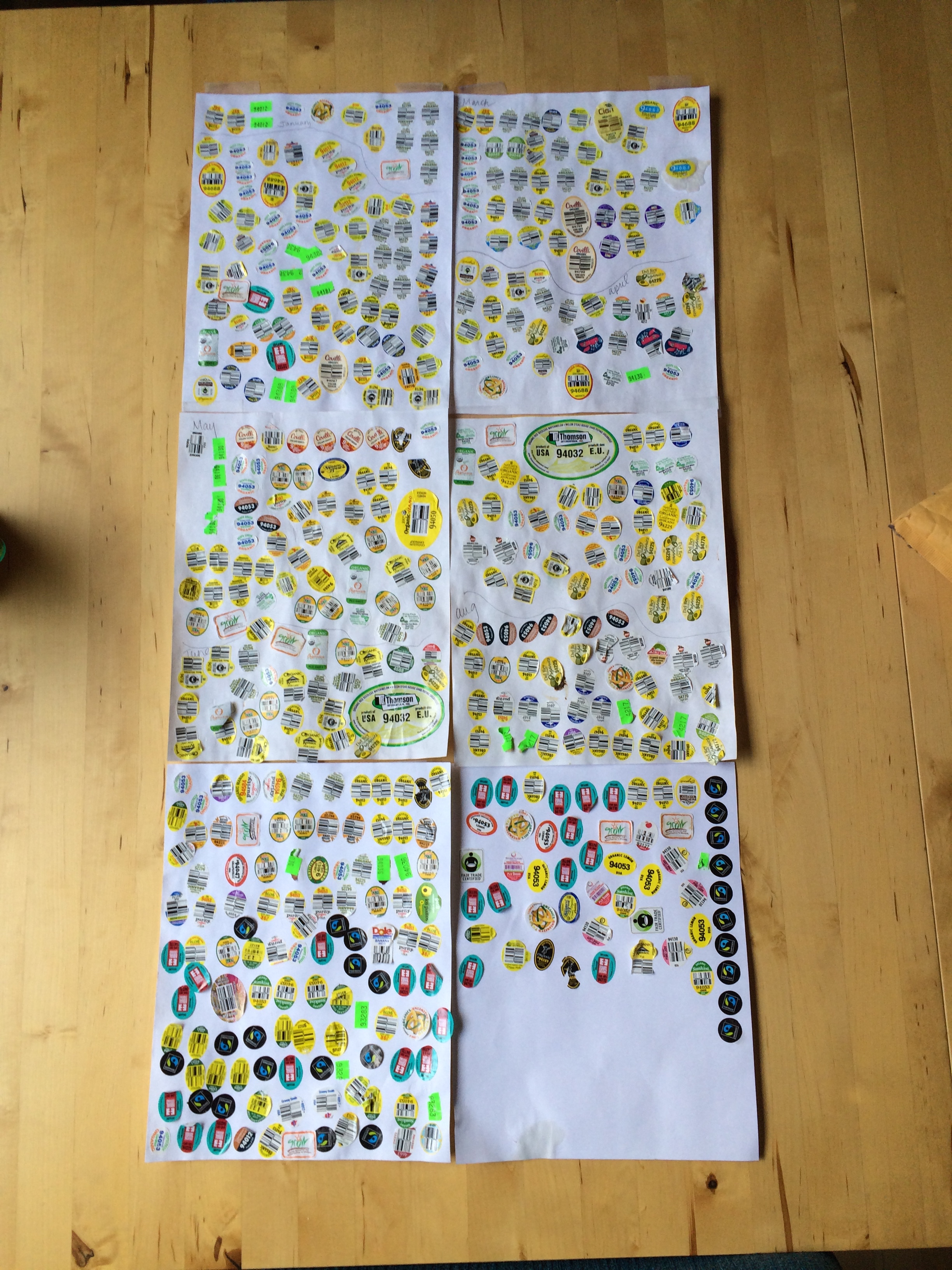 I do the same thing: http://wp.me/p4sJ3i-4W I’m saving them up until I have enough to paper a door at least. I try to shop at the farmer’s market where I can avoid these annoying stickers but occasionally I don’t make it to the market and head to the grocery store, where I might add I CANNOT find a local organic apple even though I live in California where organic farms abound(!).