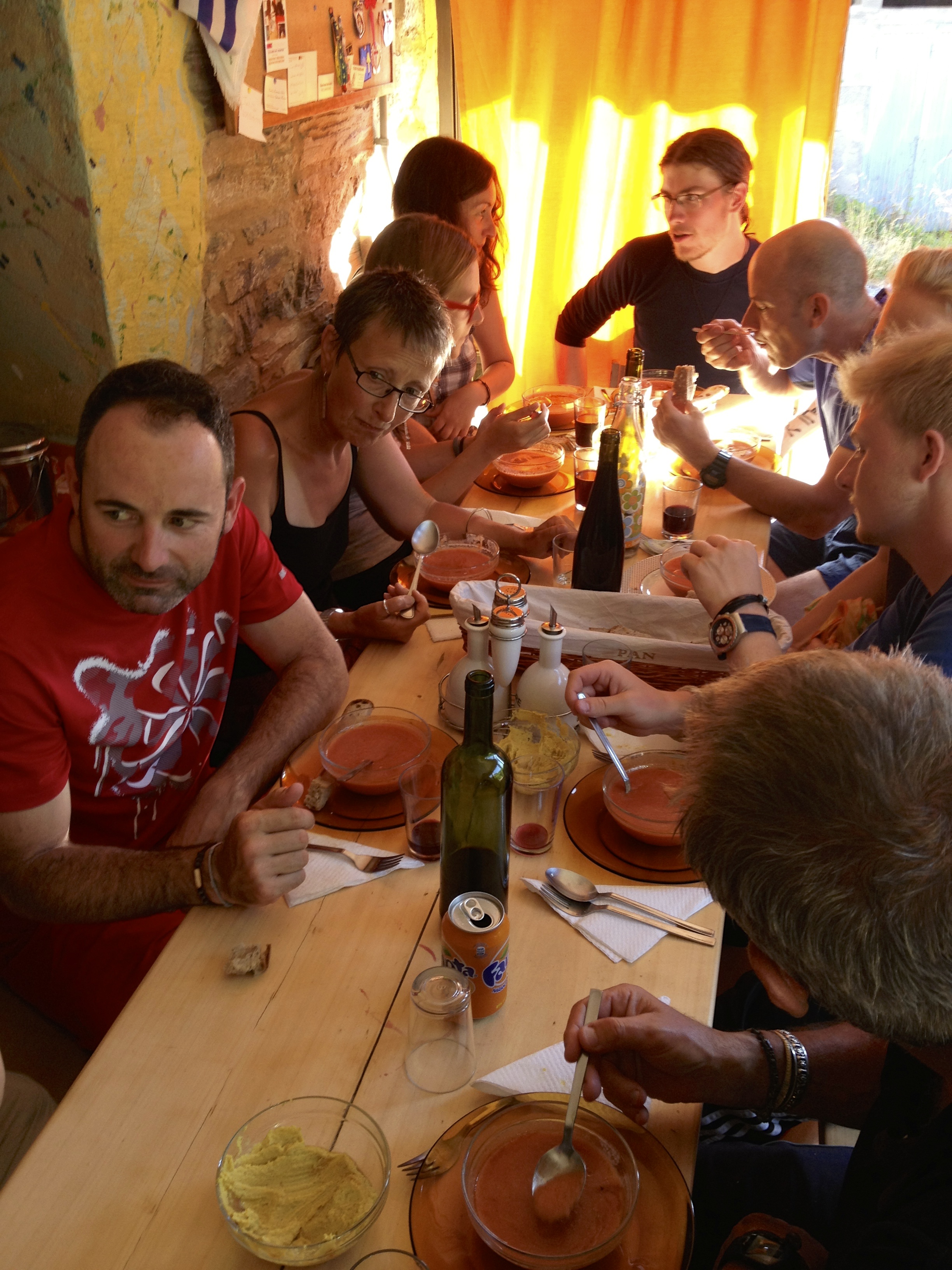 Dinner in Herrerias was vegetarian gazpacho, homemade hummus, bread, pasta, salad and cake