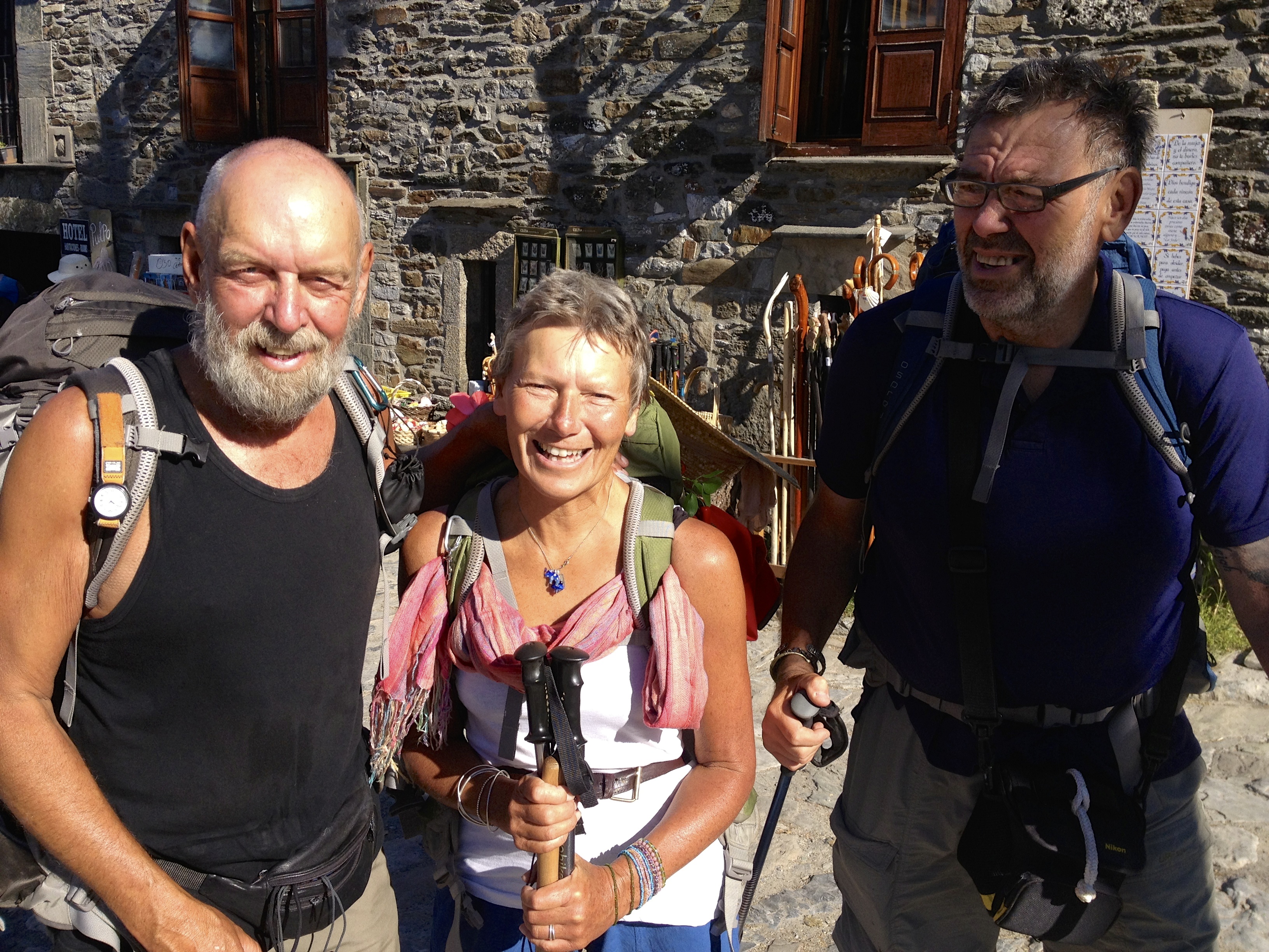 The following night we stayed in Villafranca Del Bierzo and as we were leaving town, we got lost for the first time. We soon got found as we headed up the path that was the medium difficulty choice amongst three options…it went up, up, up and then down, down, down with the heat pounding down on us. We had to stop about every kilometer or two for a cold beverage as we headed towards our goal of vegetarian dinner in Herrerias. We almost thought we wouldn’t make it, but then we did. A cool creek, kind people and a wonderful meal refreshed us along with a good night’s sleep.