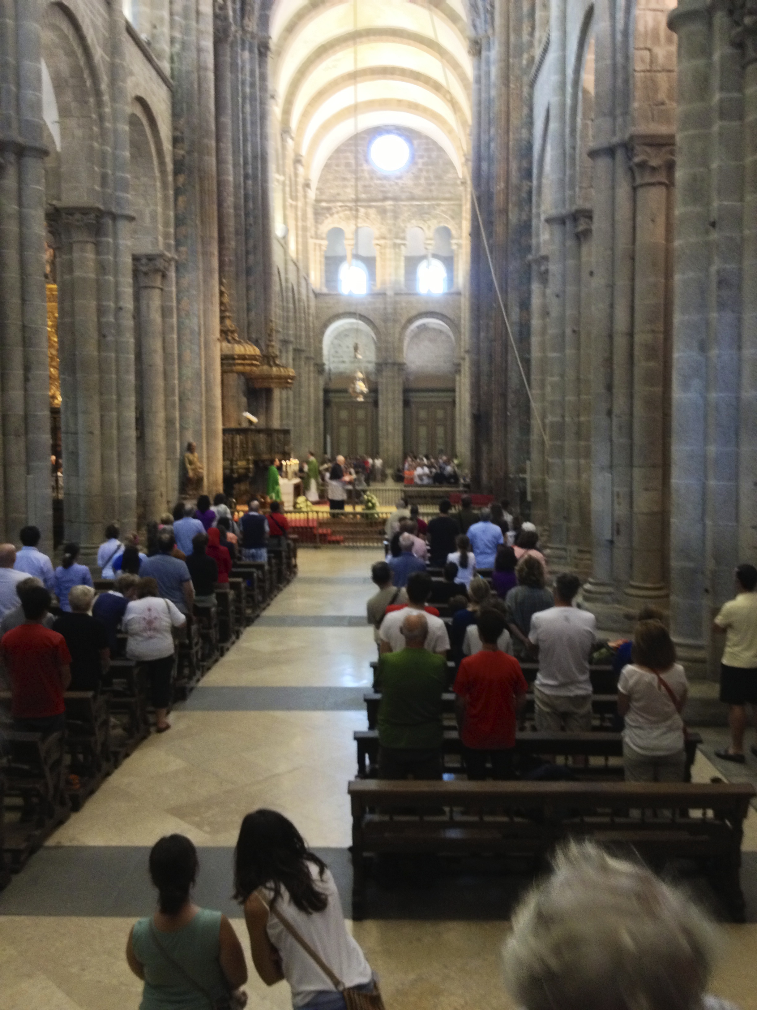 Upon entering Santiago, you see the back of the cathedral begin to peek out of the hills and scenery. Could we really almost be there? What would be next? Is it no longer going to be wake, walk, shower, sleep and repeat? We arrived near 8 AM to the magnificence of the cathedral…this vision of the goal I had held tightly in my mind was now before me. On one hand it was a BIG deal, on the other…it was merely another step. We got a meal, then waited in line to get our credentials, that paper that says we have done this 500 mile walk, and we went to mass. The bufamero’s sour acrid incense wafted past us as songs were sung and tears were shed.