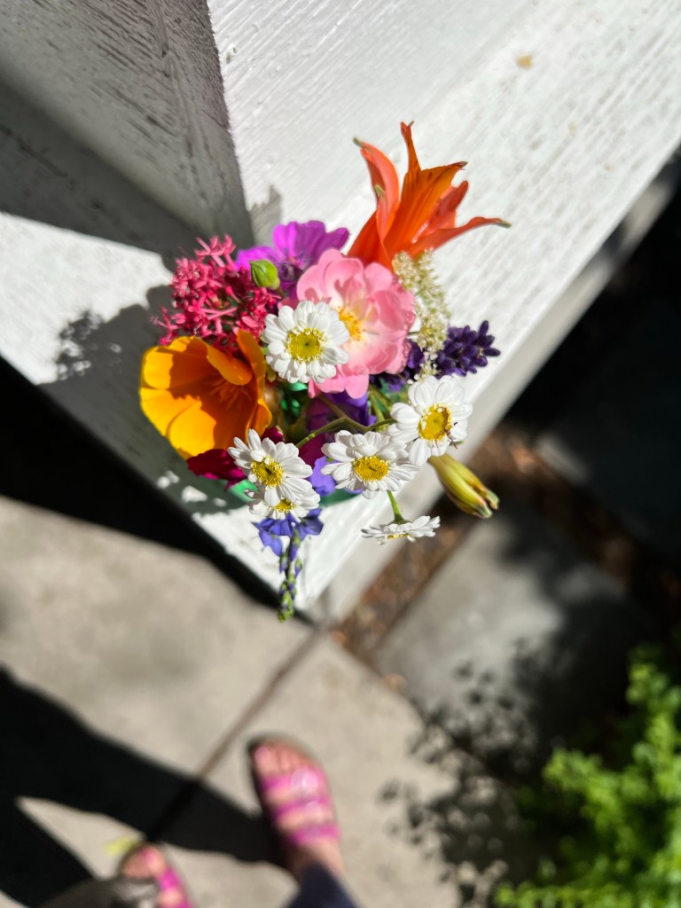 I like to take one tiny flower from each yard as I walk the neighborhood. Not enough for one person to miss, but to contribute to the diversity of colors, shapes, little faces and textures of a whole tiny bouquet!